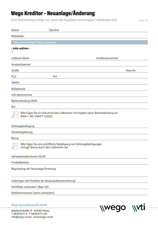 Wego Kreditor-Neuanlage/Änderung Formular