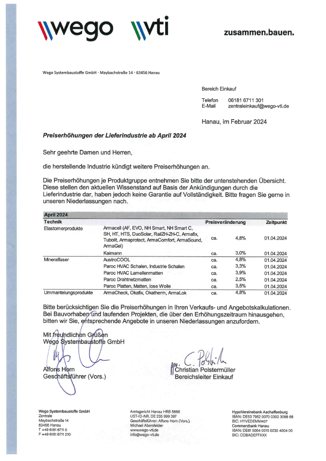 Preiserhöhungen der Lieferindustrie ab April 2024