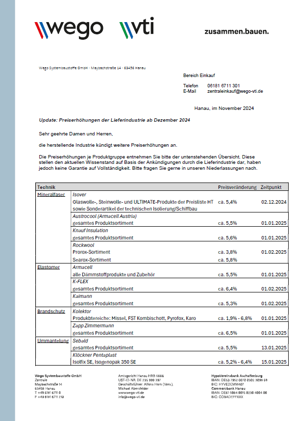 Preiserhöhungen der Lieferindustrie ab Dezember 2024