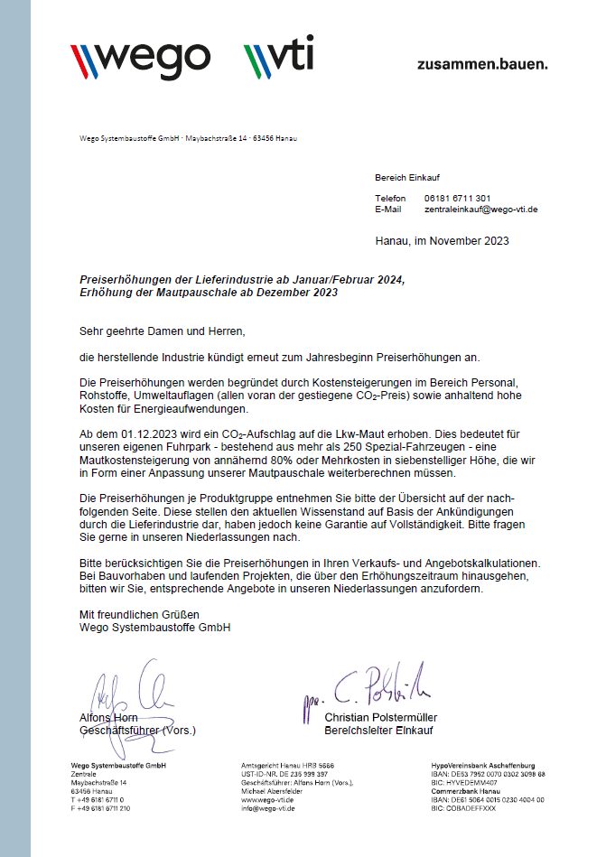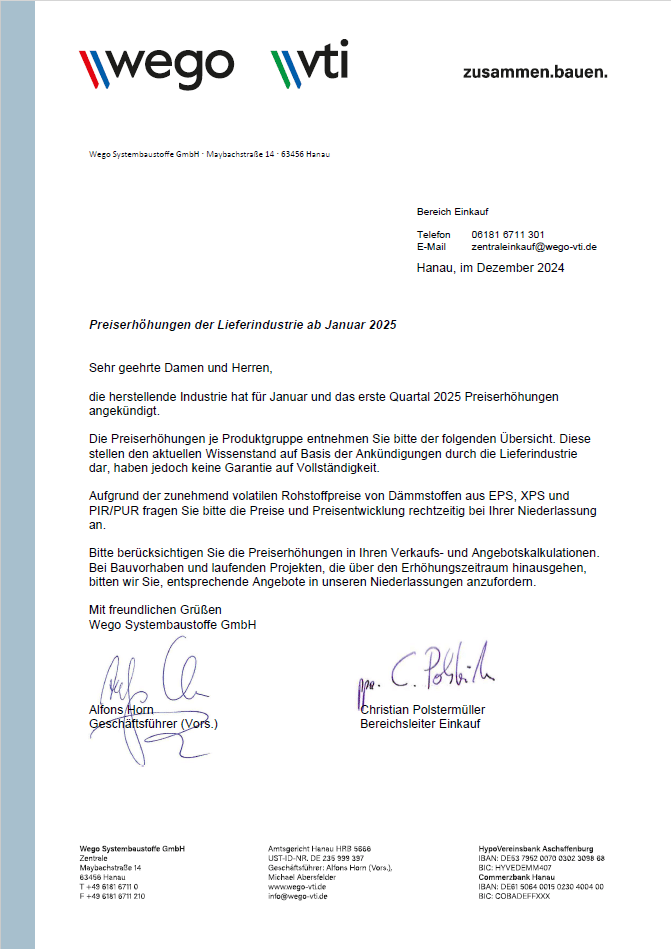 Preiserhöhungen der Lieferindustrie ab Januar 2025