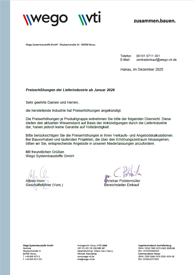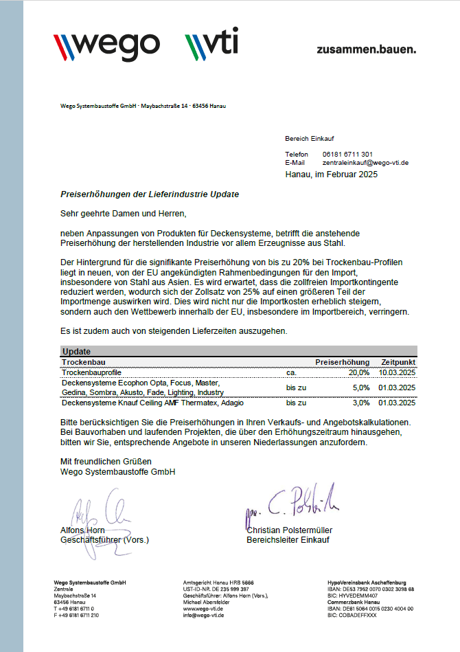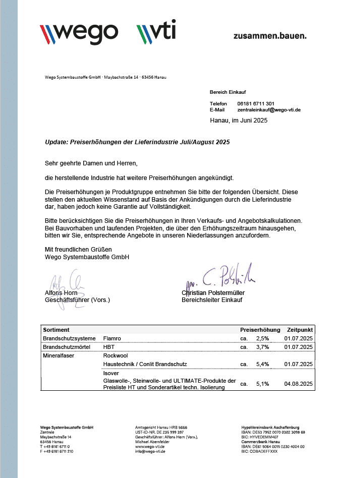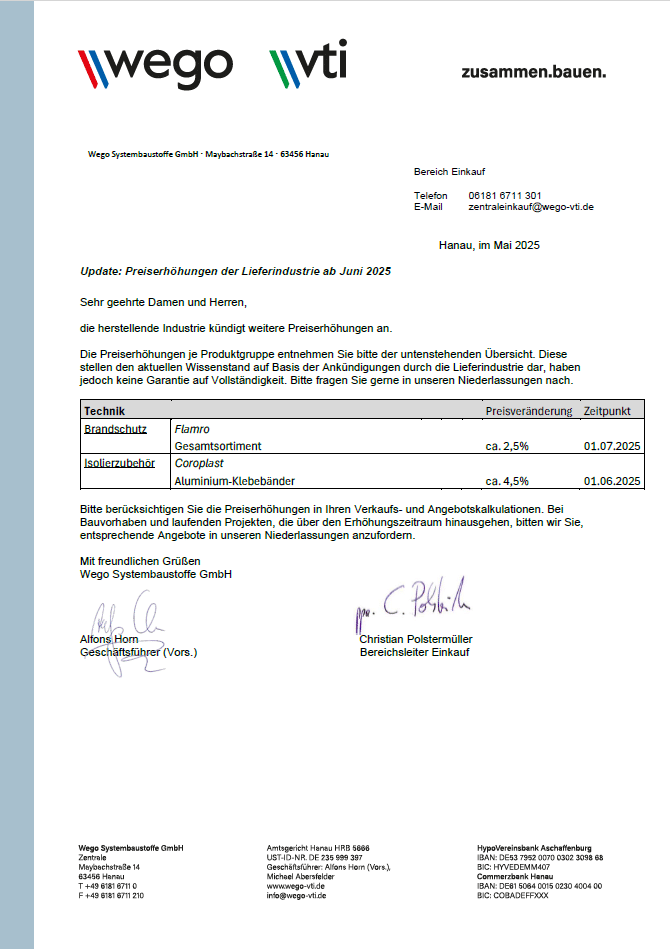 Preiserhöhungen der Lieferindustrie ab Juni 2025