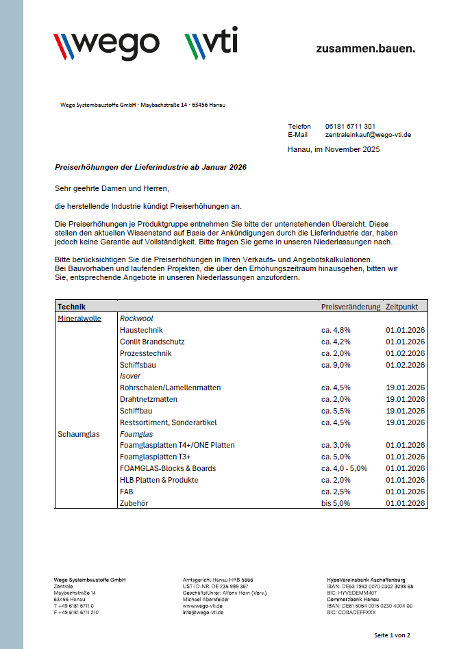 Preiserhöhungen der Lieferindustrie ab Januar 2026
