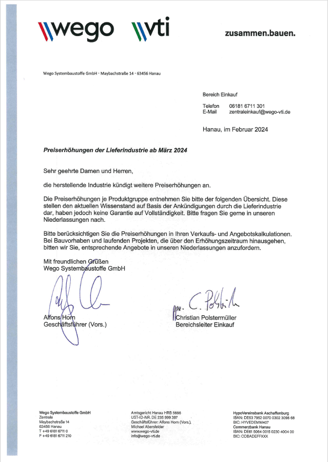 Preiserhöhungen der Lieferindustrie ab März 2024