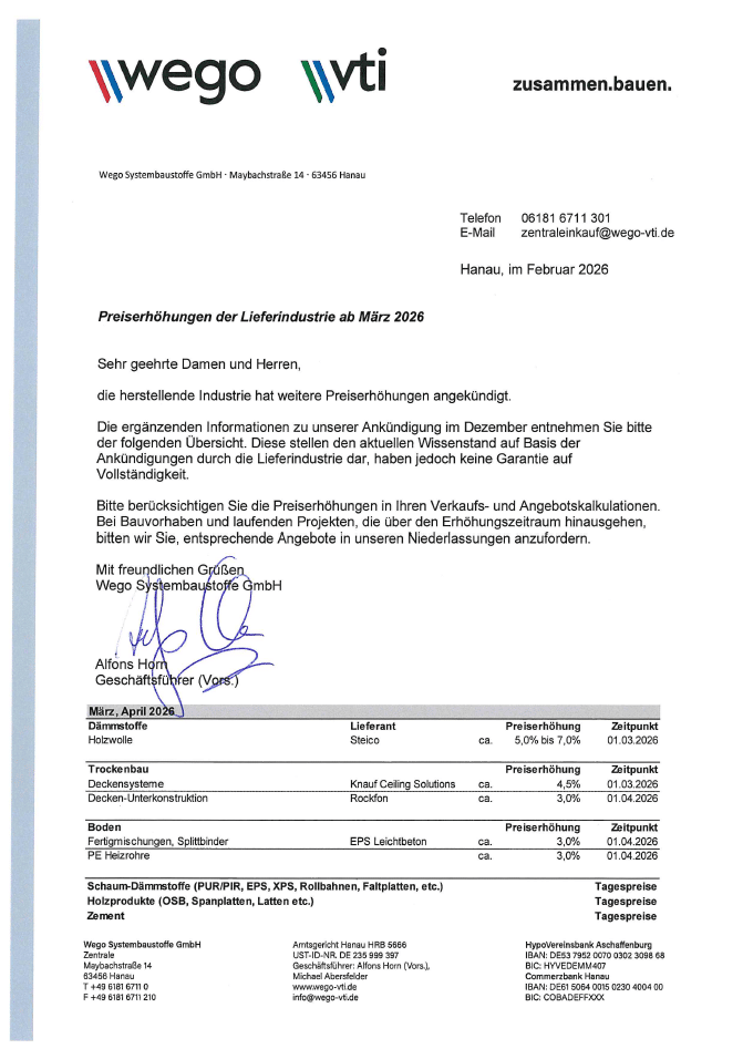 Preiserhöhungen der Lieferindustrie ab März 2026