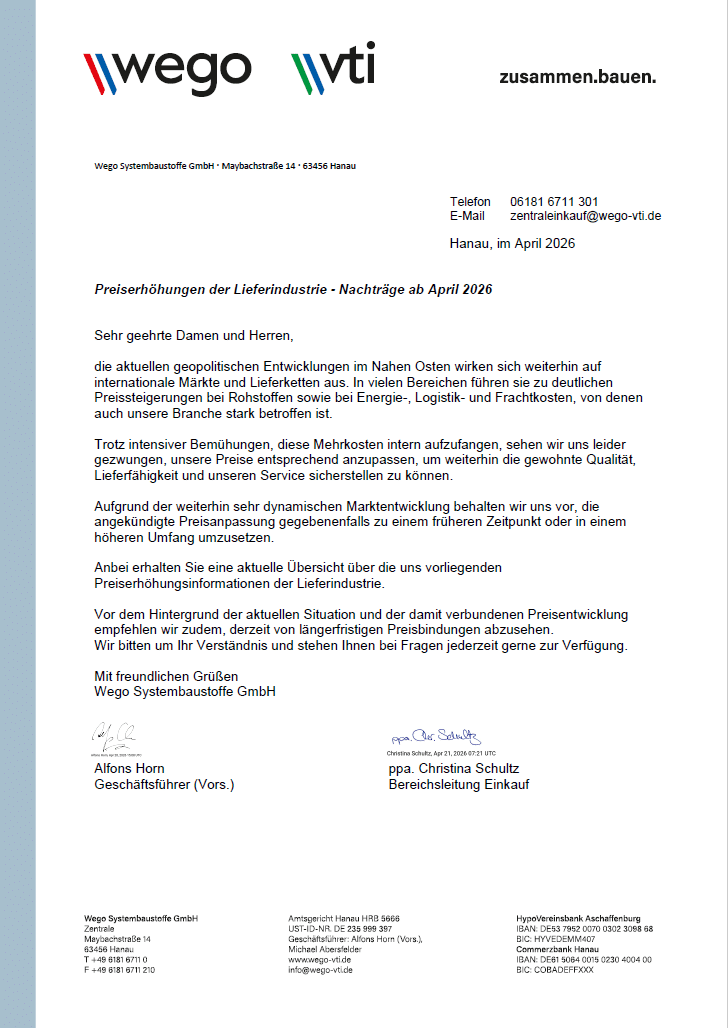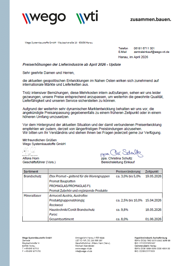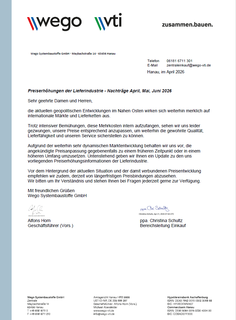 Update zu Preisanpassungen Nachträge ab April 2026